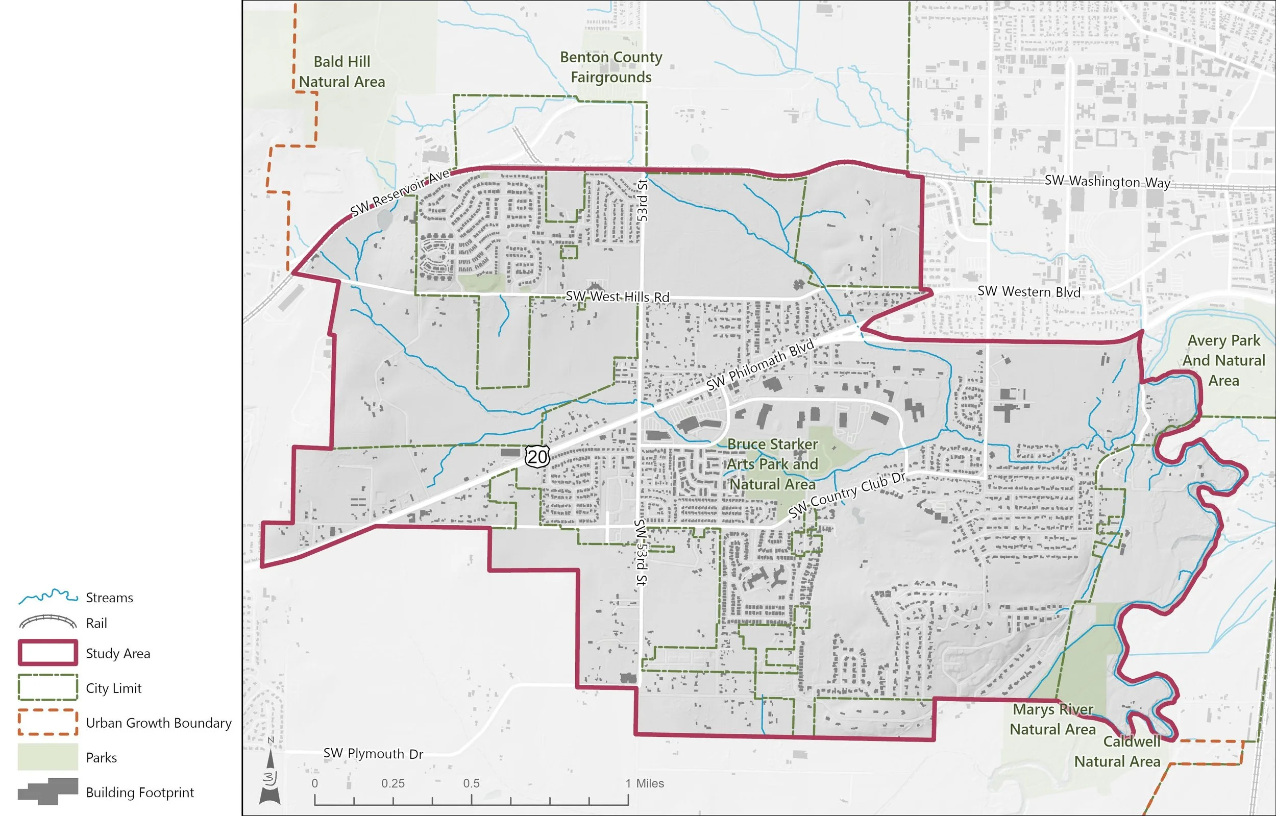 The SW Corvallis project study area is located west of Marys River and spans to the western border of the Corvallis Urban Growth Boundary (UGB). The northern boundary is the Portland and Western rail line that connects with Reservoir Avenue to the west. The southern boundary is the southern Corvallis UGB boundary, just south of Nash Avenue.